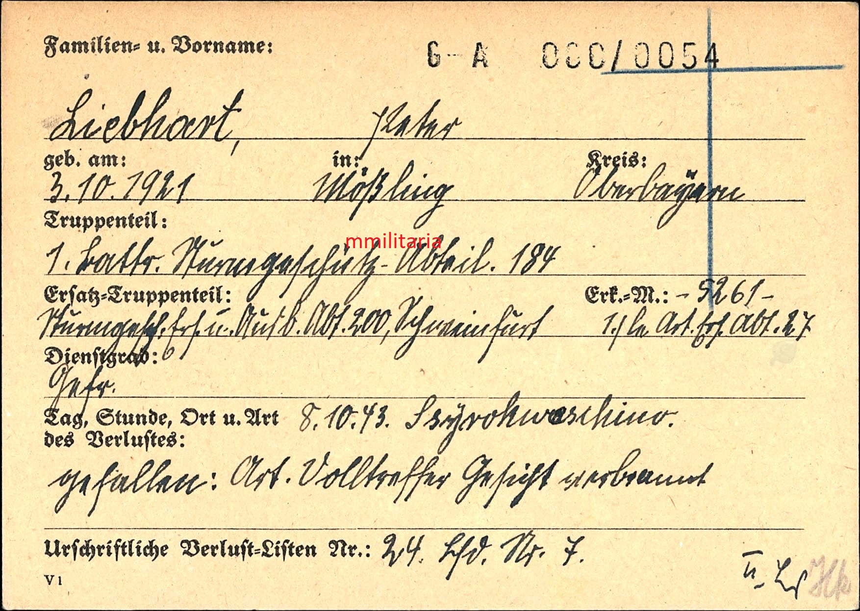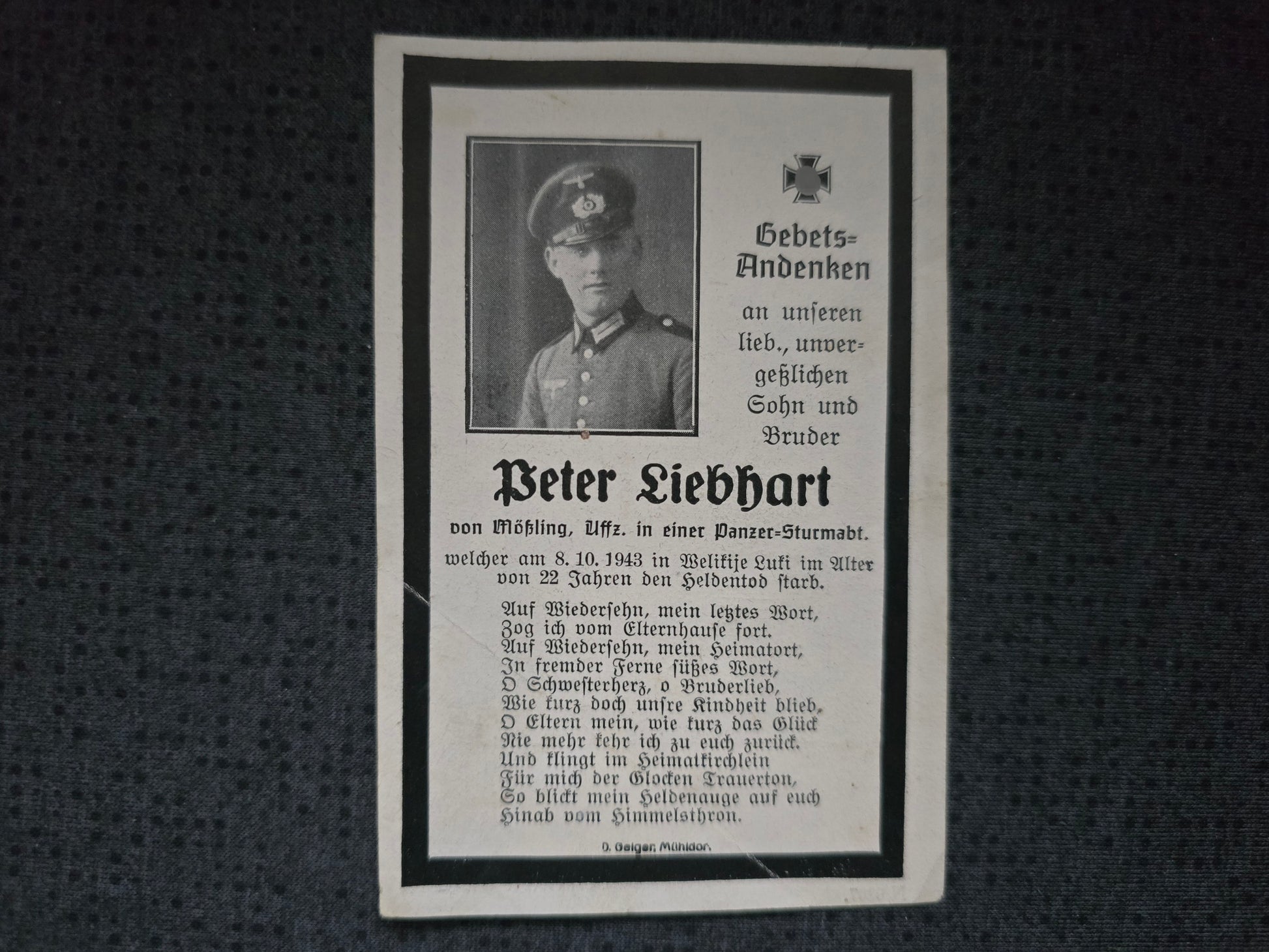 Sterbebild Unteroffizier Mößling 1. Batterie Sturmgeschütz-Abt. 184 Welikije Luki Russland