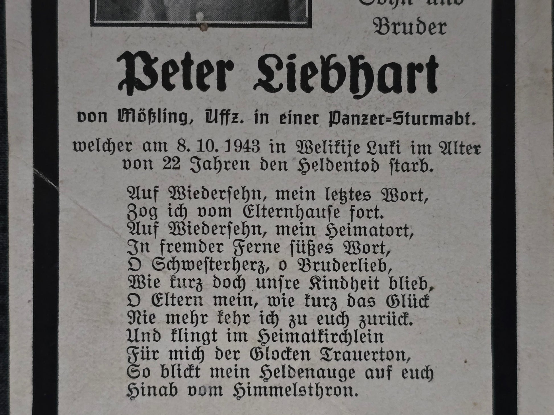 Gefallen am 08.10.1943 bei Welikije Luki (Russland)