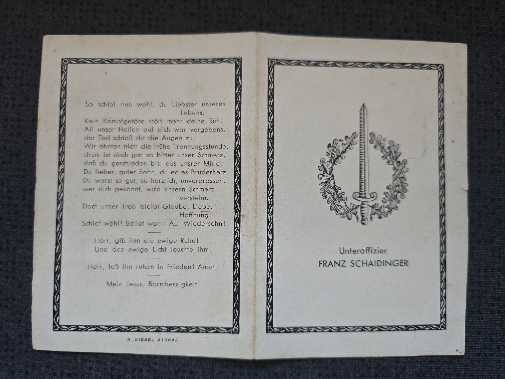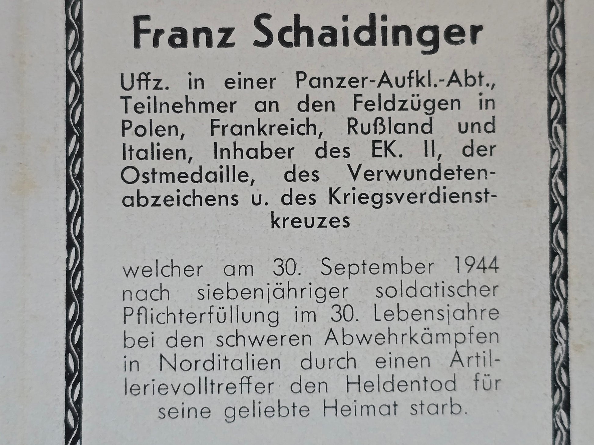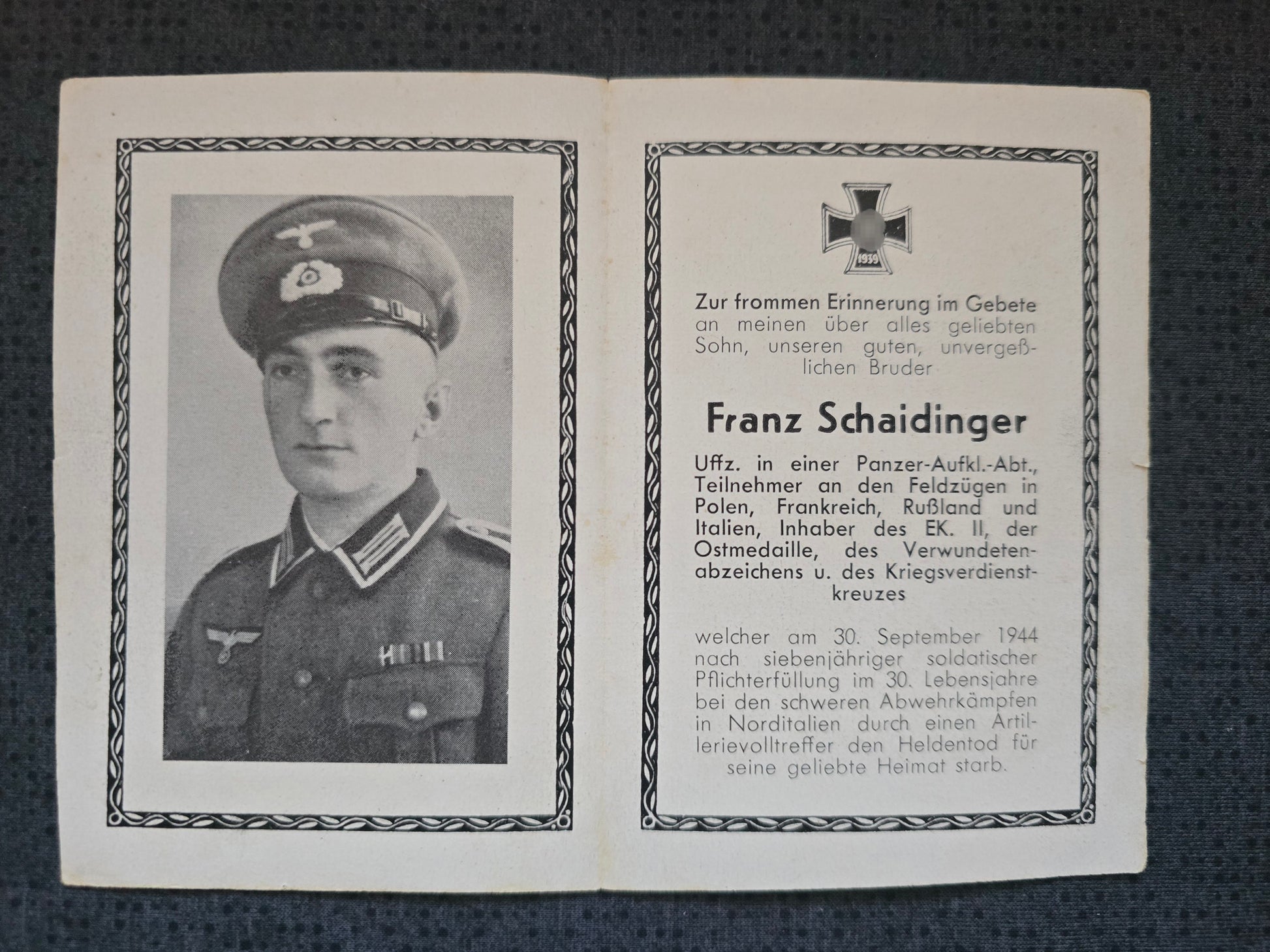 Sterbebild Unteroffizier Panzer-Aufklärungs-Abt. Artillerievolltreffer Futa-Pass Italien