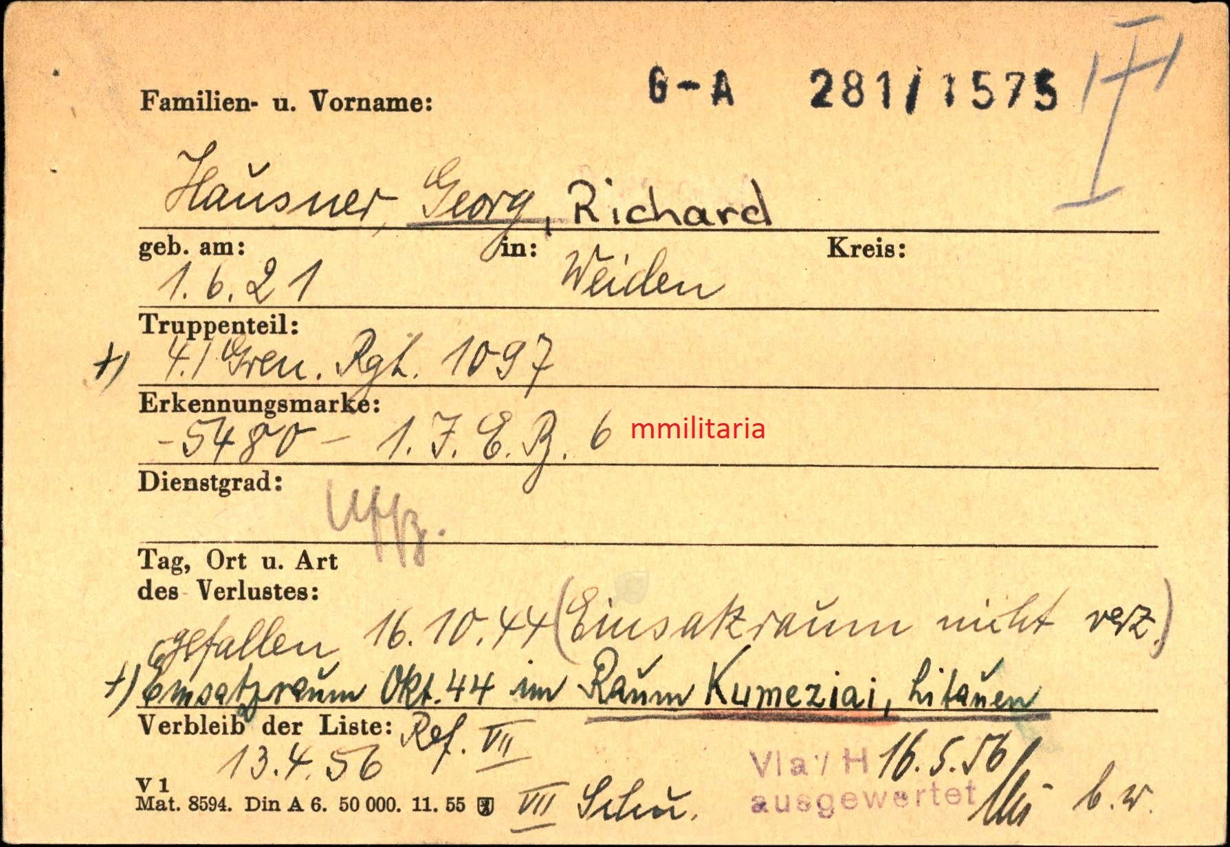Gefallen am 16.10.1944 bei Kumeziai (Litauen)
