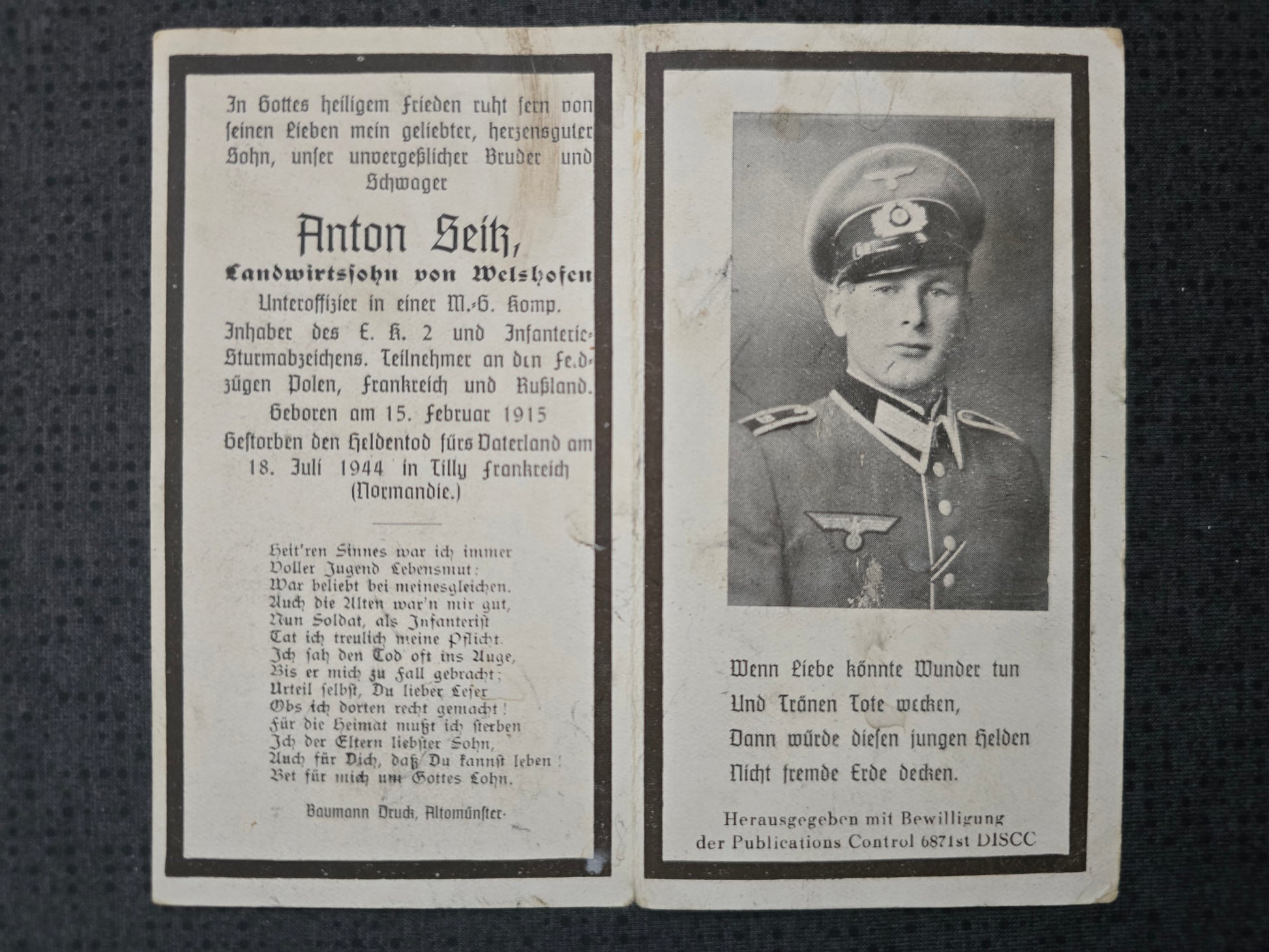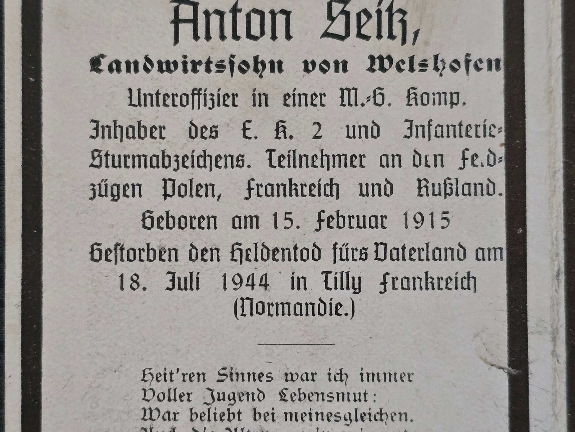 Sterbebild Unteroffizier Welshofen MG-Kompanie Tilly Normandie Frankreich