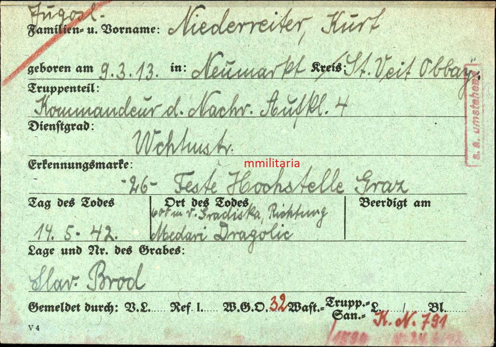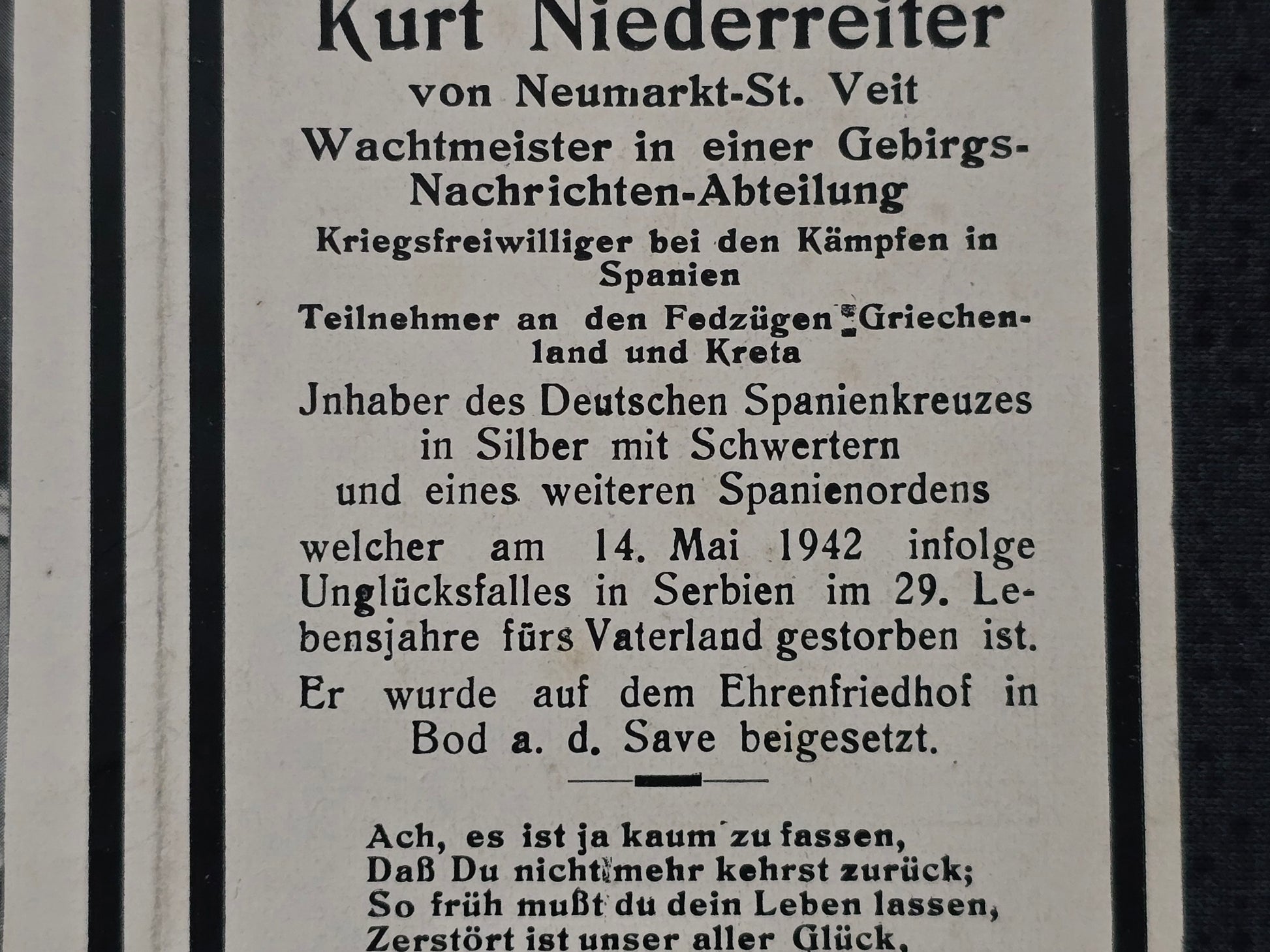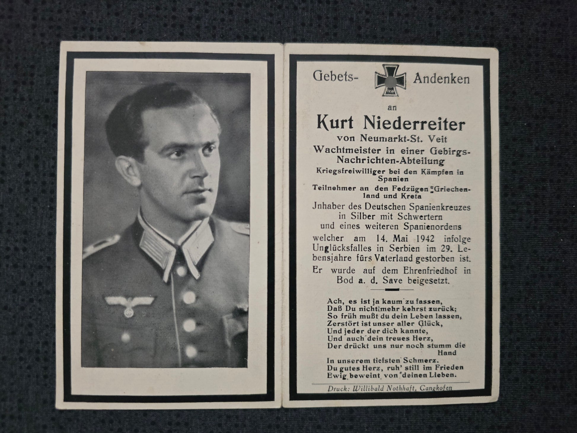 Sterbebild Wachtmeister St. Veit Kommandeur der Nachrichten Aufkl. 4 Spanienkreuz in Silber mit Schwertern Spanienorden Nova Gradiska Serbien