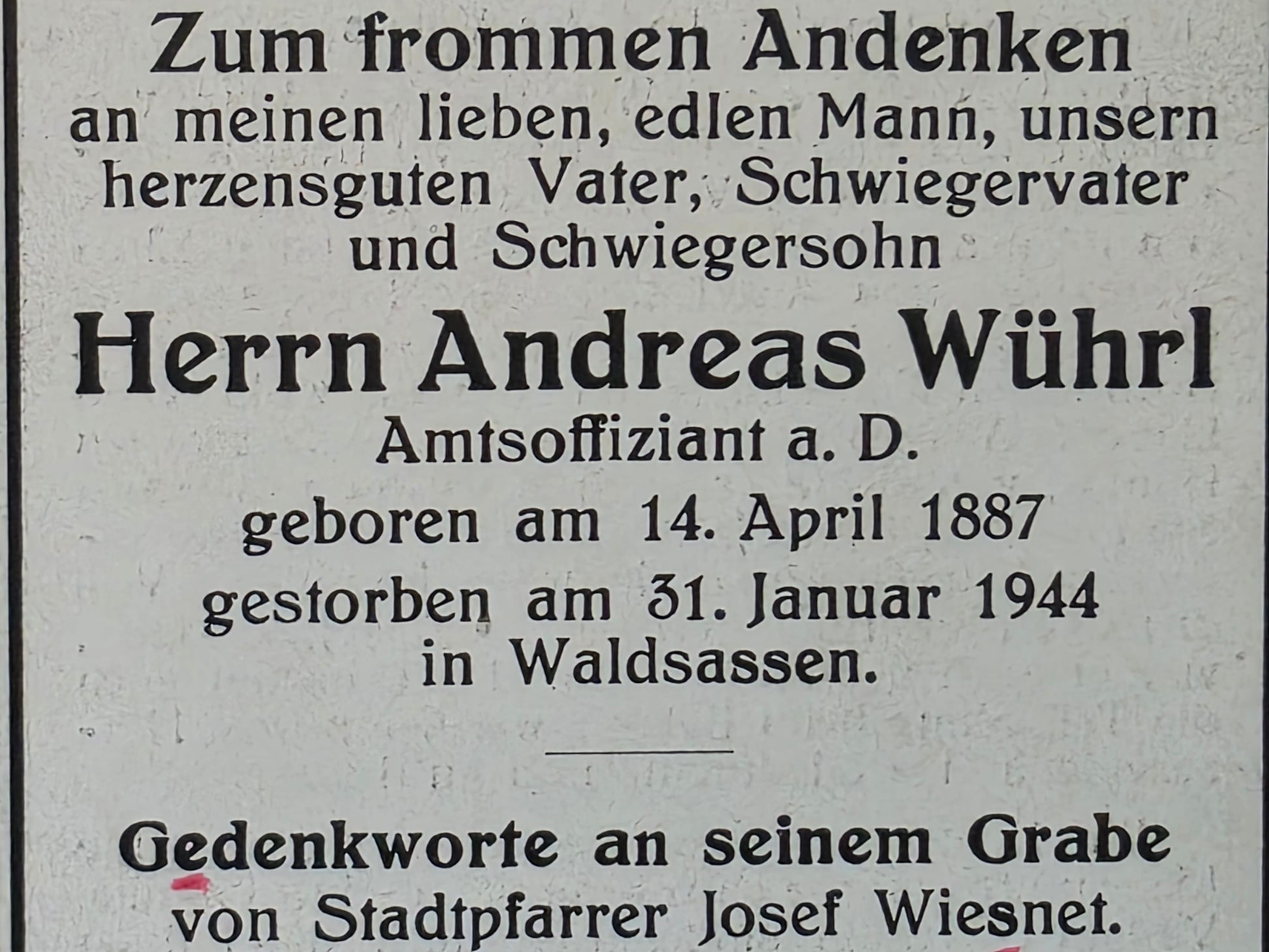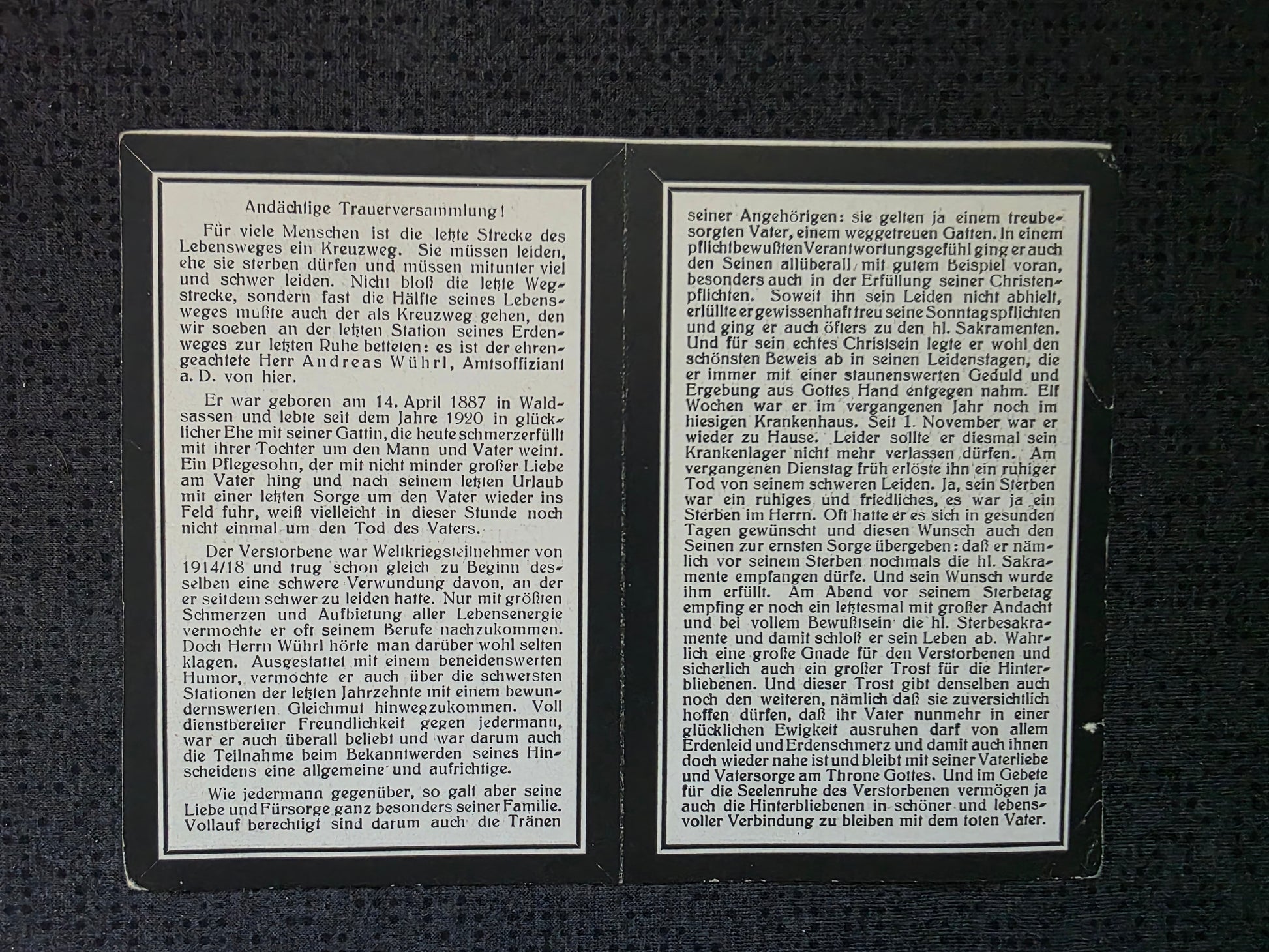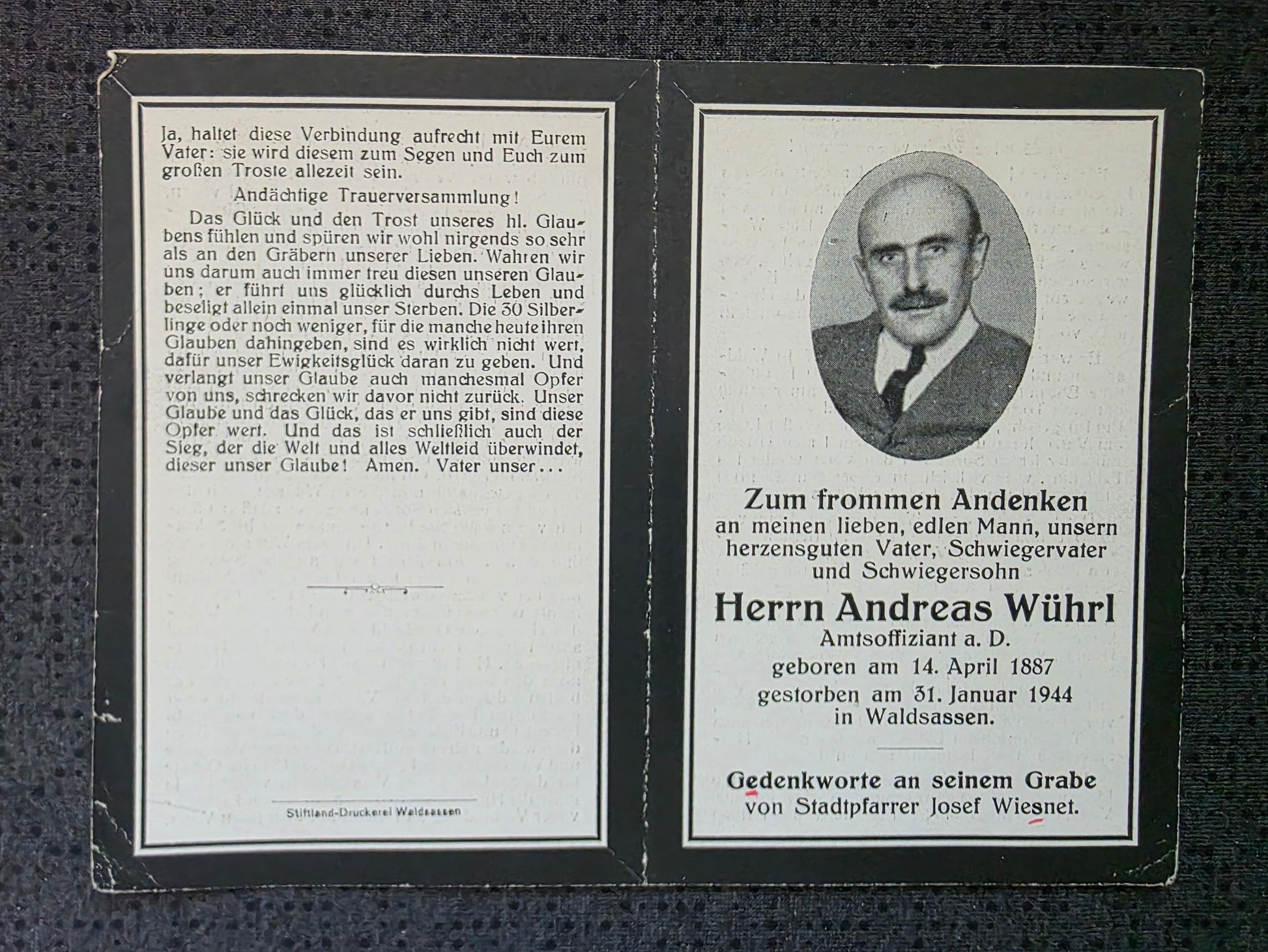Sterbebild Zivilist Waldsassen Amtsoffiziant WK 1 Veteran