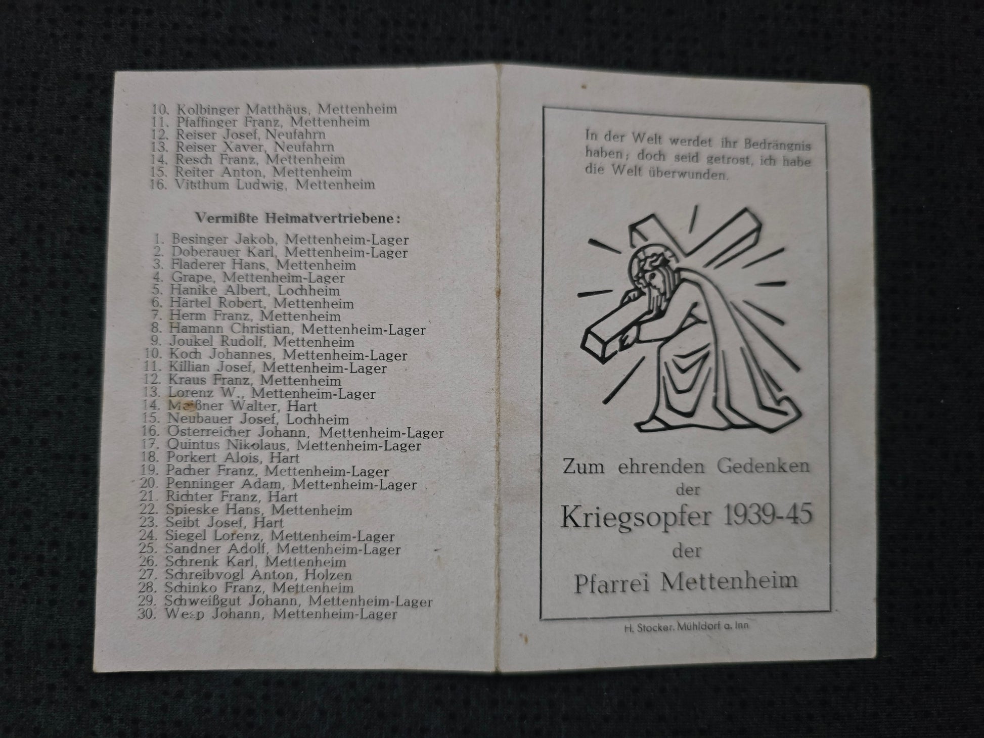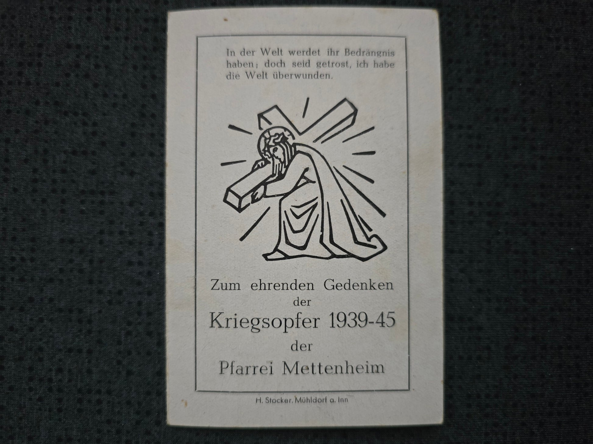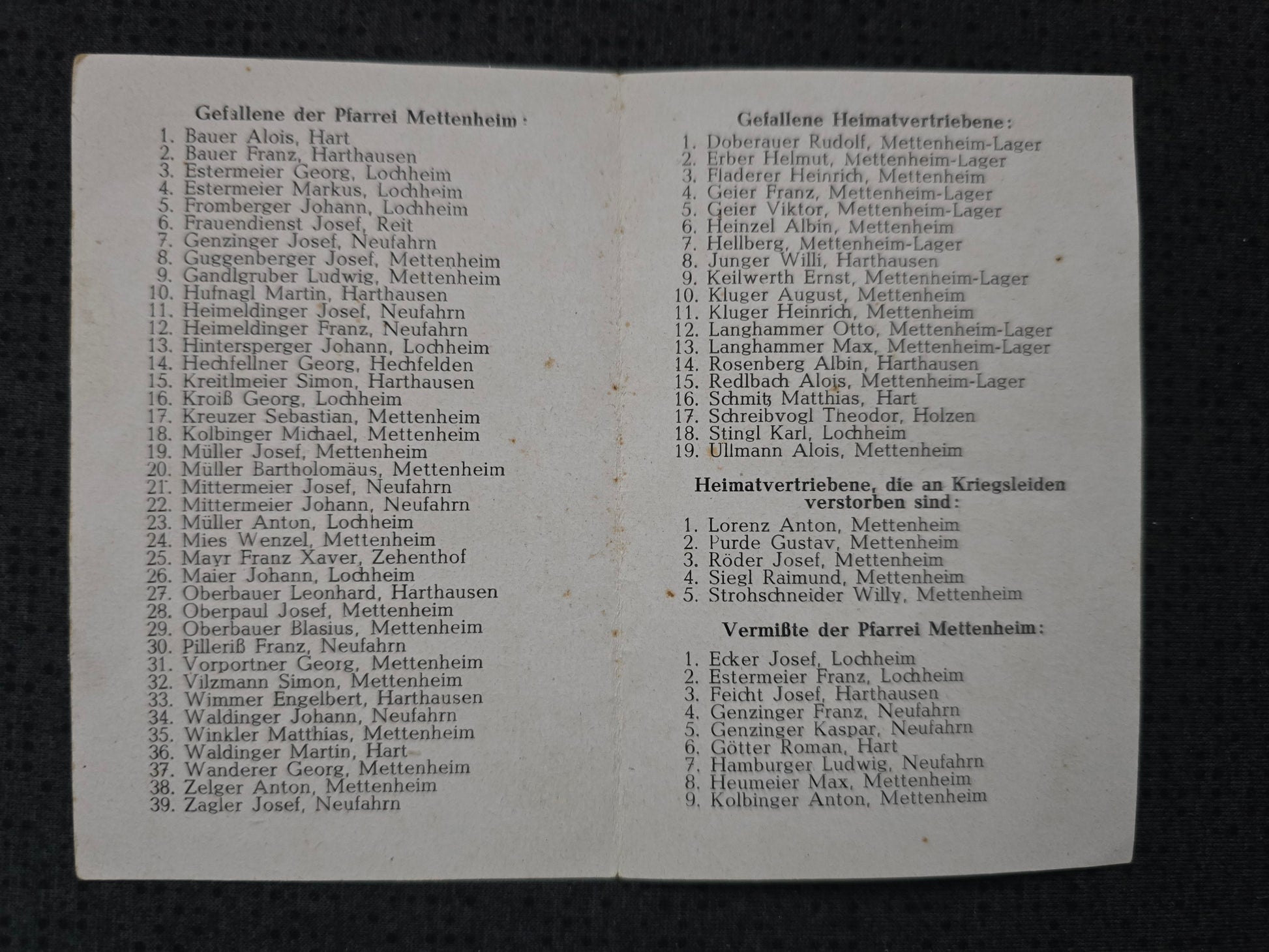Sterbekarte Gedenkkarte Kriegsopfer der Gemeinde Mettenheim 1939-1945 Gefallene, Heimatvertriebene , Vermißte